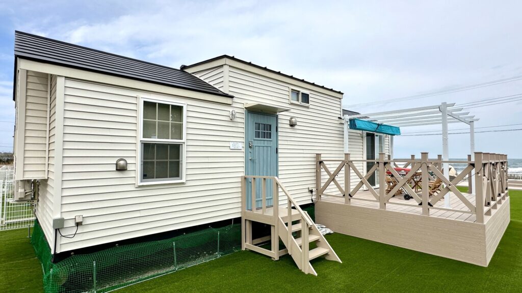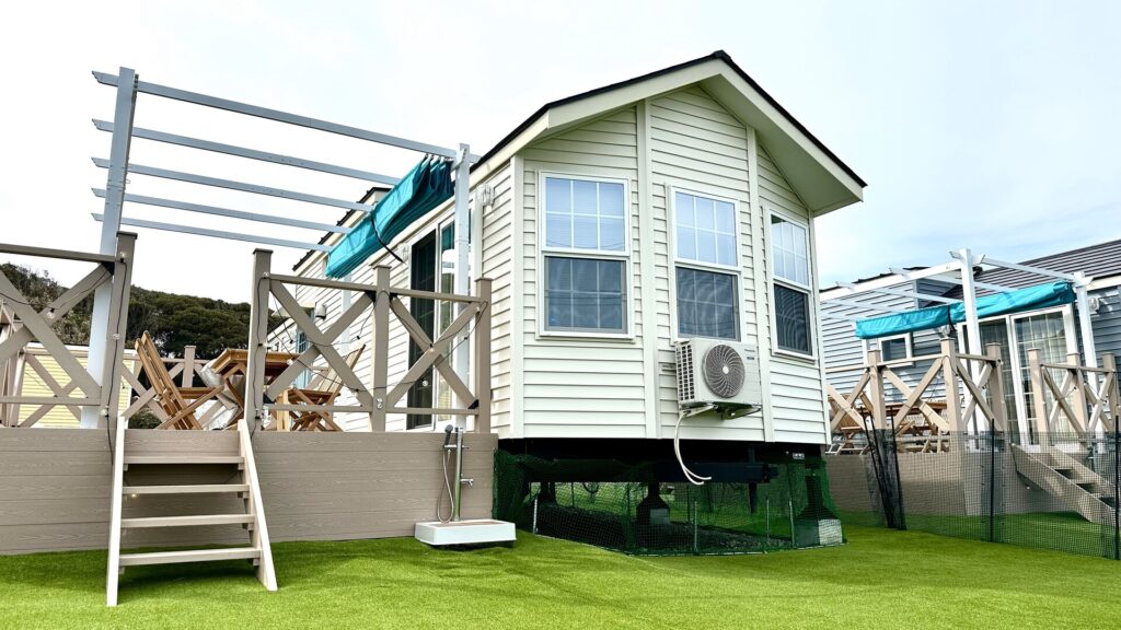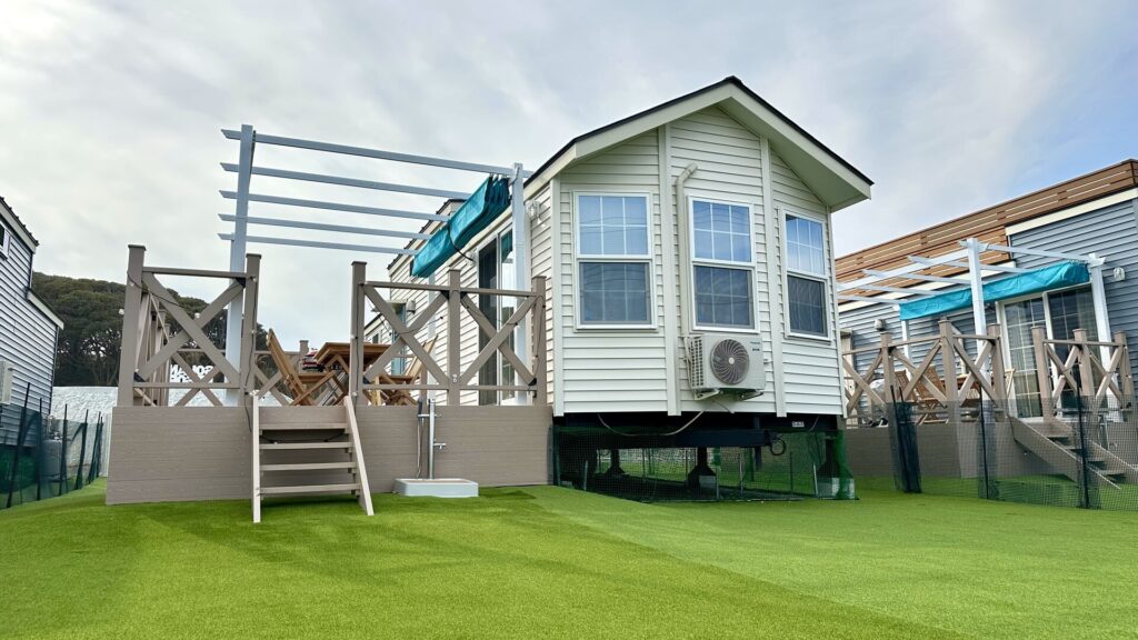 犬の宿泊料金は何頭でも無料。各棟には高さ120cmの仕切りで区切られた専用ドッグランが付き、リードオフでのびのび。犬用アメニティも豊富で、到着直後から遊べます。周囲に気兼ねしない“棟貸し”は、人見知りの子・多頭飼いに強い味方。