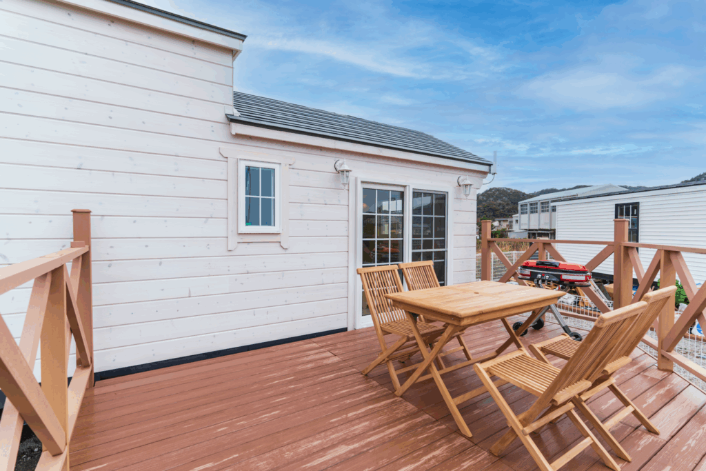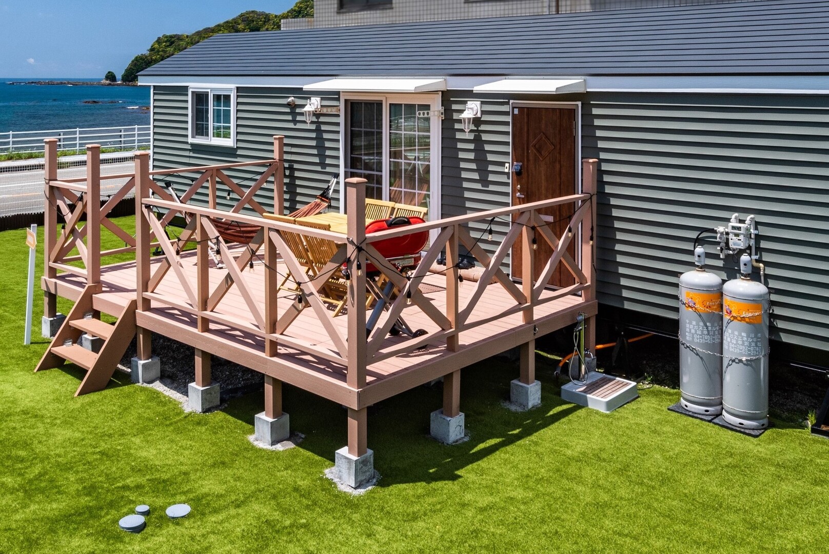 各棟テラスに“ガス式BBQグリル”—炭・ボンベ不要で到着後すぐ