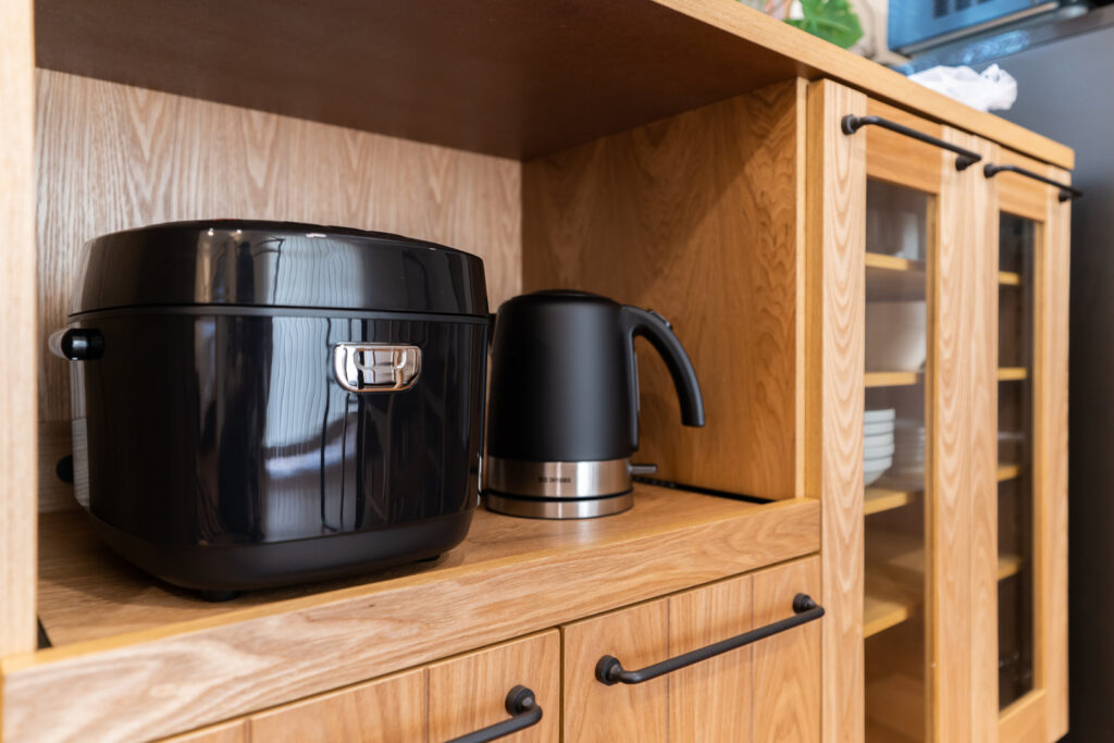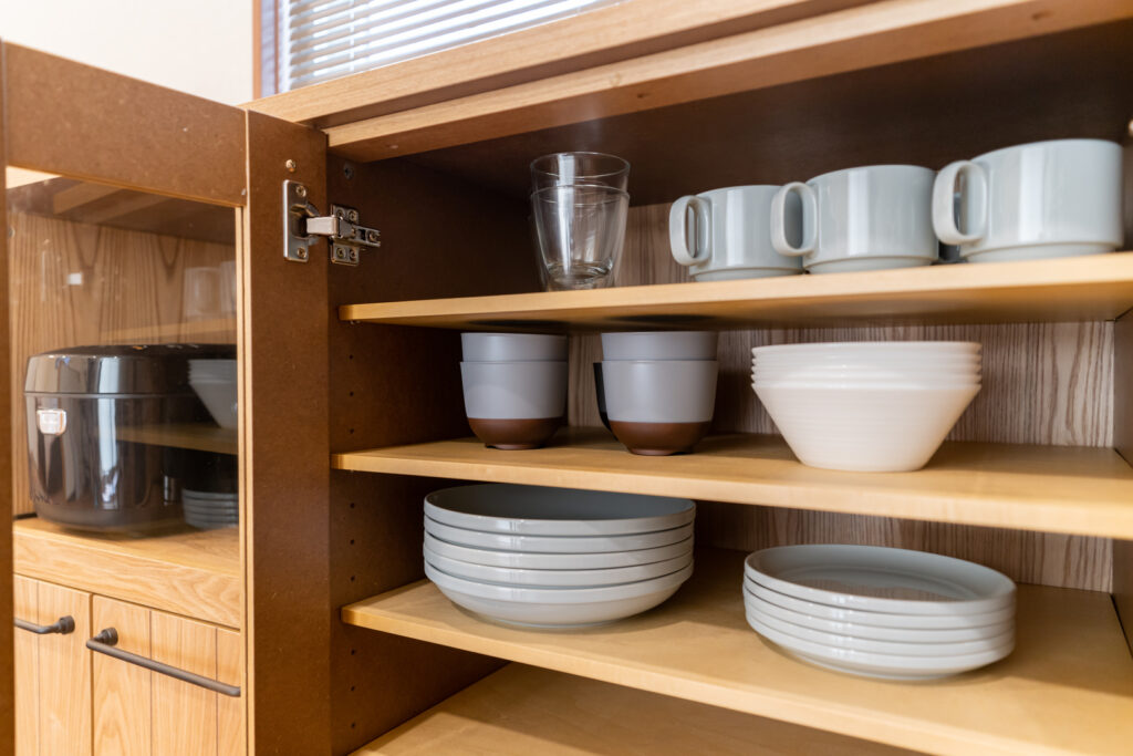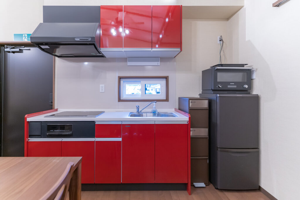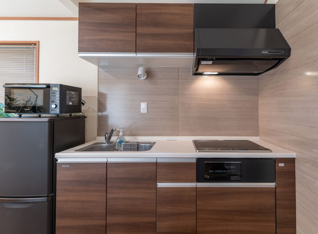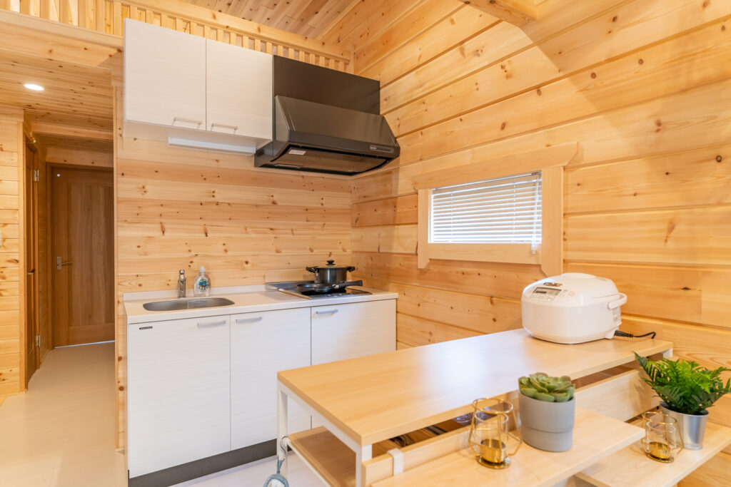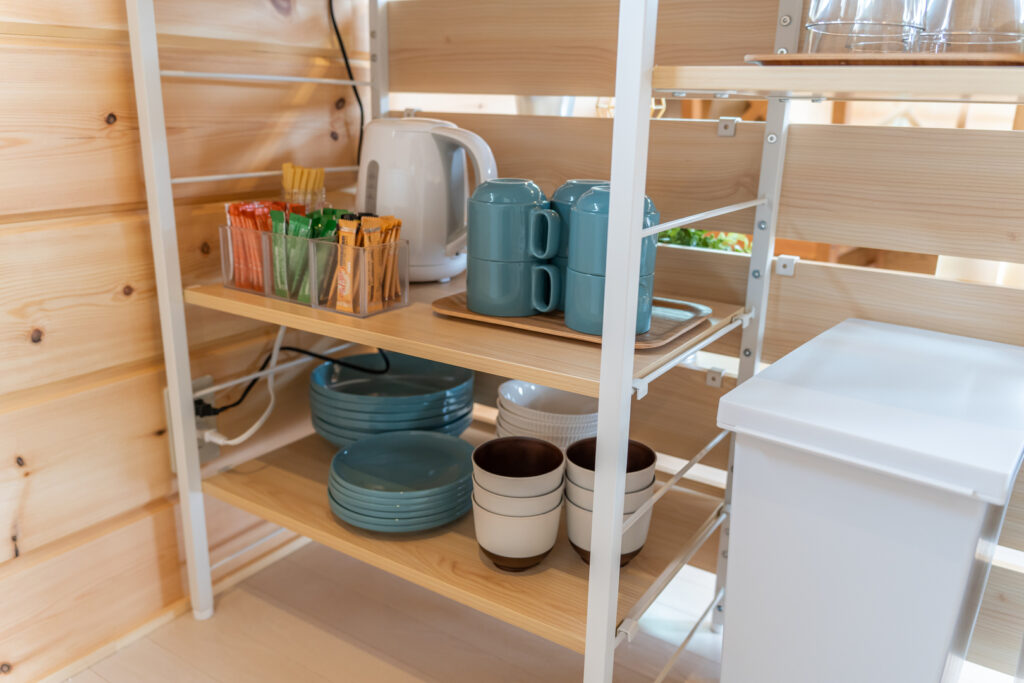 キッチン | 冷蔵庫・ガス式BBQグリル・炊飯器・レンジ ・ケトル・フライパン 鍋・ラップ・アルミホイル・食器・子供用食器・カトラリー・グラス マグカップ・トング・おたま・フライ返し・菜箸・キッチンバサミ・ピーラー 缶切り栓抜き・水切り籠・包丁・ペティナイフ・まな板・ボウル・ザル・鍋つかみ お茶・ほうじ茶・紅茶・コーヒー・水 |